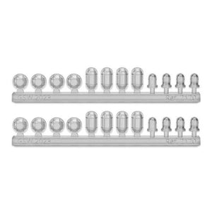 Two plaques containing 12 transparent resin industrial grilled lamps each. You can choose from 3 types to best suit your needs, whether for a diorama or for adding headlights to a vehicle.