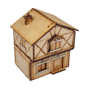 Village Maison Belle is a two-story village home, it has an overhanging second floor with external beam detailing and a small chimney on its pitched roof. Using the removable roof and second floor you can position your soldiers and garrison from the windows. Made from 3mm MDF and 1mm greyboard. It is a great piece of scenery to use on the tabletop for World War games and will work perfectly with other 25mm games.