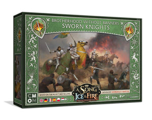 The Brotherhood Sworn Knights unit box for the A Song of Ice and Fire: Tabletop Miniatures Game gives Brotherhood Without Banners players a new cavalry option for their forces. These trusty knights are sturdy and pack a punch. Also, their prowess can rally other troops to keep fighting even if all seemed lost.