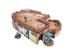The Al Medinat Madrasa (1) PREPAINTED is a one big building with interestingly angled walls, removable railings, recessed doors and niche designed to provide extra cover, with a floor at half height fitting Hammam or Minaret, dedicated for Infinity the Game by Corvus Belli.