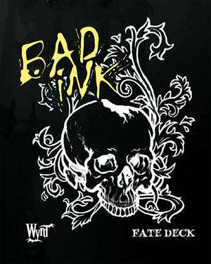 The Bad Ink Fate Deck contains 54 color playing cards designed for Malifaux. Instead of the standard suits, this deck uses the four suits of Malifaux: Rams, Crows, Tomes, and Masks. In addition, the deck also indicates Weak, Moderate, and Severe to make their use in Malifaux easier.