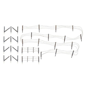 Line the edge of a pasture with handmade, pre-strung N scale Barbed Wire Fence. Barbed Wire Fences come with loose corner post support pieces and feature a double-gate with detail hinges. Simply place the fencing around an area, and then set the planter pins, drill and glue.