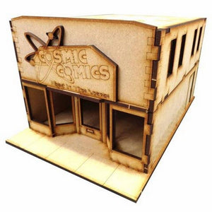 The Comic Store is made from 3mm MDF, easy to put together and looks great on the tabletop. It is a great piece of scenery to use with the Batman Miniatures Game. We advise using PVA glue to build it for the best results.