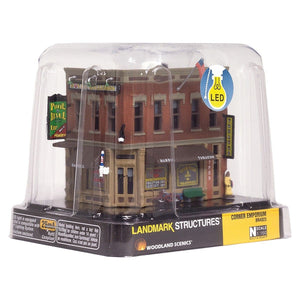 The Corner Emporium is an old-time three-in-one store. There is a barber shop in the front with a tobacco shop in the rear, with billiards upstairs. There are three cycles and an old Cigar Store Native American statue outside the door. This building has signs, posters, a flag, awnings and an old barber pole. The Corner Emporium has one LED light to show off the printed interior.
