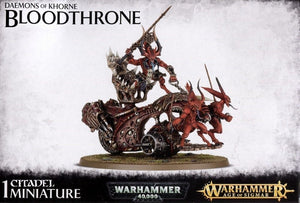 The Daemons of Khorne Bloodthrone is a mobile altar dedicated to the mighty Blood God, which is driven to battle by a murderous Herald of Khorne. Riding this Chariot is a pair of ravenous Bloodletters, and the machine is adorned with the bones and flesh of its latest victims. The Bloodthrone is an unstoppable chariot of destruction.