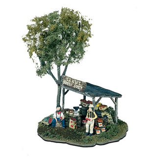 Ernie sell tons of fruit and vegetables out of his stand. Includes the stand, Ernie, another man, the shelves with fruit, one tree, foliage, the base and assorted pieces. This scene is designed to fit in our Glass Display Dome and Base (M127).