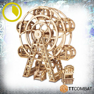This kit is made from 3mm MDF and a small challenge to put together. Care must be taken as we have utilized a bendable MDF construction to create the carriages. Yes, it rotates, has a ticket booth for the fair goers and is perfect for 28-35mm tabletop games.