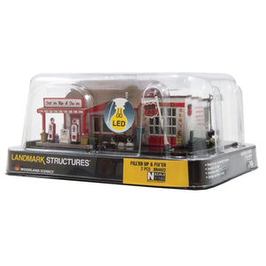 Layout residents can savor a Yoo-hoo or a sody-pop with peanuts while waiting for the mechanic to change the oil and fix a tire. Details include signs, posters, old gas pumps, old and new tires, a pop machine, junk and more.