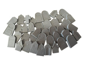 The pack contains a random selection 40 Gravestones. Gravestones are of varying sizes with a max height of 18mm, max width of 15mm, and max depth of 6mm.