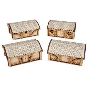The Halfling Homestead makes a lovely little grouping of houses for your diminutive chums. The four houses are all uniquely detailed (with round doors of course). They are perfect on their own, or as part of a larger modelling project, like putting them on the side of a hill.