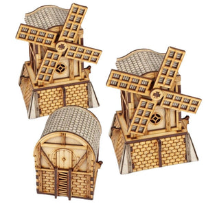 This set contains two large windmills, primary used for milling grain but also to tell if it's windy outside so you can decide to stay in your halfling hamlet next to the fire. Also in this set is the raised grain store, keep your grain high, dry and next to the windmills. No rats can get to it and it speeds up the production of bread, without which sandwiches could not be made.