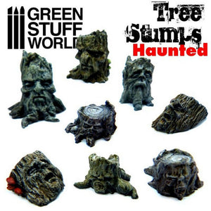 Set of high-quality resin Haunted Tree Stumps. Professionally carved accessories with varying facial expressions, adorned with small skulls and mushrooms, ideal for fantasy, enchanted or haunted forest themed dioramas. This product comes unpainted and is perfect for 25-28-35 mm miniatures (1:76, 1:48, 1:35).