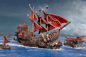 The largest and most improbable orc vessels are the Ripper Hulks – and hulks they indeed are. Captained by the highest-ranking Krudger in the fleet, their tactics are simple but effective. In battle, they sail slowly and inexorably towards the biggest, baddest enemy ship they can reach, and set to work with their crude machinery – huge saws powered by goblin crank-wheels that can cut a three-decker in half, mechanical battering rams capable of denting even a dwarf ironclad, and other devices more at home in a siege than on a ship.