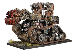 Death Engines are strange, rickety contraptions crewed by “volunteers”; no two are ever of the same design. A bizarre mix of arcane science and cunning sorcery, these great mechanisms rumble and grind their way through the enemy ranks, striking out with dark energies at those it cannot crush beneath its churning wheels and spinning blades.