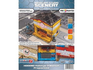 The Kokkyo-3 Market PREPAINTED set consists of 2 buildings, which can be combined in various positions. What's more, multiple Kokkyo-3 Market and Quarters buildings can be stacked together! The set is dedicated for Infinity the Game by Corvus Belli.