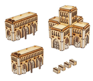 Gothic inspired with 2 long buildings, one large cross building, and 4 shipping containers, this set is a great addition to your games of Dropzone Commander or Adeptus Titanicus.