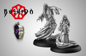 Struck down by a young and inexperienced Takashi ashigaru during the war against the Shiho, this spectral maiden now haunts the swamps of Sagoya wailing and lamenting her and her family's untimely deaths. Not even death has set her free from her earthly pain and suffering, and so she does everything in her fell power to bring wrack and ruin to all who are unfortunate to encounter her. This ghost now haunts a Yokai Maiden feeding on fear and haunting the places where it is most felt as if she were mysteriously drawn to it. She is as cursed as the city from which she emanates.