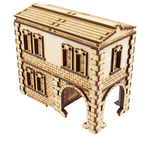 This kit is made from 3mm MDF and has been designed for Carnevale, using multiple storeys to climb and jump, and roofs at easy angles so that miniatures will not fall off when darting across the Venetian skyline. It is a great piece of scenery to use with other 28-32mm games.