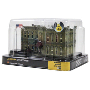 The Municipal Building is a two-story brick-patterned city hall and police station. Building details include window shades, a propane tank, electric meter, awnings, exterior signage, drainage spouts, and rooftop ductwork and chimneys. The set includes a red metal canon and Old Glory waving atop a flag pole.