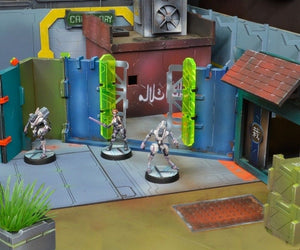 This product consists of 2 sections of walls with a Hard density cardboard gate. They are perfectly compatible with the Neon City Walls and Fences using this section as an open space in your walls. The gates are pocket sliding and can be set in open and closed positions.