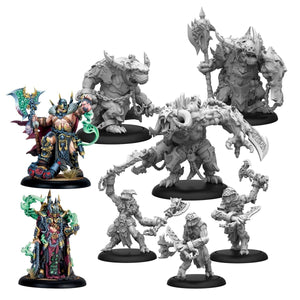 Alongside deep psychological trauma and generational anguish, the most tangible record of the first Orgoth occupation were the infernal relics they left buried beneath their hellish places of execution. For a time, such artifacts were harnessed by misguided arcanists hungry for prestige and influence but who were ultimately ignorant of their true power and implications. No mere weapons, such devices were once the prized possession of fell reavers and soul-fueled warlords, champions of the masters of the Outer Abyss. Now, with the return of the Orgoth comes Oriax, the Soul Slaver, and his accursed retinue. Weaving blasphemous soul magic, Oriax has the capacity to dominate both beast and machine. He is accompanied by Halexus, The Warlord, a soul-starved herald and bloody avatar of the Fellgoeth infernals. Held in their thrall are the Gnashers, Ulkor shock troopers dominated by the maligned will of their paired hell-wrought weapons, and the massive Ghrotten Champion and Keepers, fearsome warriors likewise slaved to their infernal arms. And most terrible of all, the abominable Raveners: part beast and part machine, these howling monstrosities are the cursebound equivalent of the heaviest warjacks and are devoted utterly to their master's fearsome will.