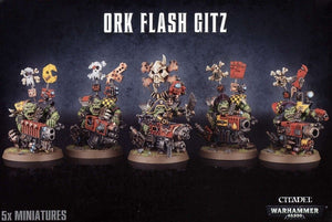 This multipart plastic kit makes either 5 Ork Flash Gitz or 4 Ork Flash Gitz and 1 Kaptin. Armed with huge deadly Snazzguns, the kit contains lots of additional components meaning that no 2 Flash Gitz need ever look the same.