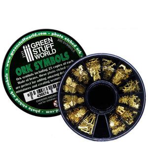 Collection of 300 ork themed runes, symbols and signs made of brass. There are 12 different types to choose from, separated in different compartments. They are perfect for adding details to armour, weapons and banners of your models and miniatures or for decorating dioramas. We recommend using cyanocrylate glue in small quantities.