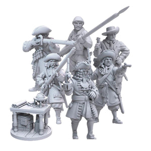 Port Royal is a campaign based, tactical, small-scale warband-sized skirmish wargame that is easy and fast to learn and play. Loosely based on the historical events following the 1692 earthquake that devastated the island of Jamaica. In Port Royal, players take control of small companies of pirates, privateers, Native Americans, African Maroons, or local government forces as they battle against opponents for their share of the plunder that litters the ruins of the place. Players will gain loot and experience between games while building infamy and growing in their piratical expertise. But take heed! The ruins are fraught with dangers! Falling buildings, wild animals, desperate civilians, and opposing companies can bring a quick end to members of your company.