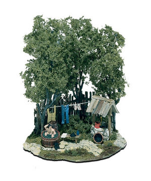 Whether he needed it or not, he always gets his bath. Includes a wooden “privacy” fence, the clothesline, clothes, a well house, four trees, foliage, the base and assorted pieces. This scene is designed to fit in our Glass Display Dome and Base (M127).