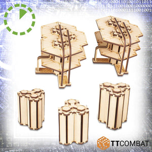 Silo Triads contains 2 large silo clusters with walkways and 3 silo clusters without walkways. These make great scatter terrain and do a good job of breaking line of sight. The walkways on the large clusters provide plenty of space for infantry.
