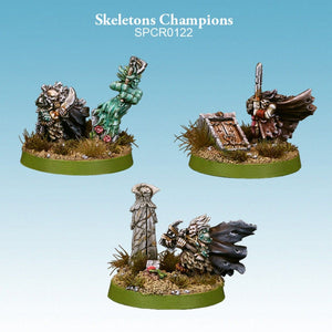 The set contains 3 one-piece high-quality resin miniatures of Skeletons Champions with additional decorations and three 25 mm round plastic bases The miniatures are dedicated for the Lord Necromancer's Sheol-morg army.