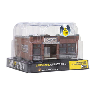 Smith Brothers TV & Appliance carries the newest televisions, refrigerators and more. This 1950s era Built-&-Ready structure features flickering TVs tuned into the latest programs and a brand, new colored TV on display. Illuminate the store and switch on the TVs with LEDs made for use with the Just Plug Lighting System. An eye-catching printed interior creates the illusion of depth, from the shop at the front to a stockroom in the back. The building is hand-painted and weathered with loads of signage. Other exterior details like a loading dock with a dolly, a dumpster and more add to the building's authenticity.