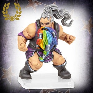 Sonja Proudbeard brings a bit of colour to the dwarven lineup, now well known in the ring for her rainbow coloured beard, fierce language, and fighting style. This Sturdy dwarf doesn't skip leg day, with a Short-Up-Kick that can be used against an opponent's DEF or DEX, as well as a Sliding Knee Strike. Once she's riled her crowd up Sonja really puts in her all, getting re-rolls for the rest of the round.