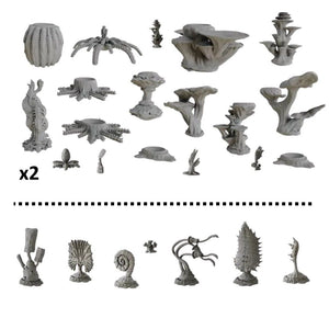 The jungles of Katakan IX are not a place for a quiet picnic. Bizarre alien trees emit clouds of toxic spores and those that wander off alone might find themselves trapped and slowly consumed by the more hungry plant life. Create an incredible battlefield or adventure scenario using these modular trees.