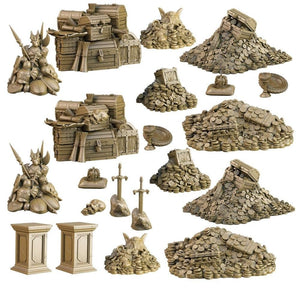Perfect to represent the final area of a dungeon or the inner vaults of a dragon's hoard, this set includes material wealth of every kind! You'll find piles of gold coins, chests, crowns, armour and weapons, including the fabled sword in the stone... well, two actually!