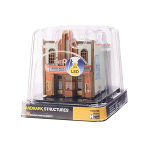 The Theater offers classic vintage architecture, an expertly weathered stucco-over-brick exterior, tall arched windows, gilded kick plates on front doors, a decorative tile facade and carved wood trim. Window treatments and decals are included. This building features a first-floor printed interior, a lighted marquee, and one interior light.