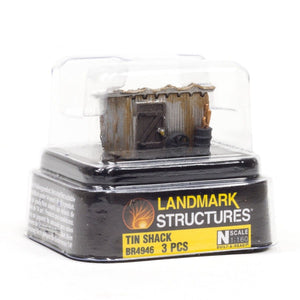 The Tin Shack's rusted metal walls and weather beaten door shows its true age after standing tall for nearly thirty years through rain, sun, and snow. This building includes a corrugated metal roof and walls with a little rust, and a wooden door. A barrel of iron and an old wheel can be seen leaning against the wall. Exterior details are unattached for customized placement or to be used as an addition to other structures. Add Shacks along the track or behind factories, businesses, and homes to create even more realistic detail.