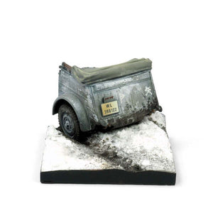Rear section of the popular German Kubelwagen vehicle. The original has been designed in 3D, exclusively for Vallejo and includes a textured base to represent muddy grounds, desert or snow covered terrains. The base is ideal for placing one or two figures.