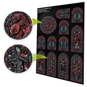 The main feature of Green Stuff World's miniature stained glass is our innovative double-printing system. This unique method ensures that the designs remain visible and striking, even without backlighting. Whether your model is displayed in a well-lit area or a darker setting, it retains its beauty and clarity. This double printing system also makes our product ideal for use on black backgrounds, where traditional transparent stained glass effects might be lost. This innovation ensures that even in less-than-ideal lighting conditions, its visual impact enhances the overall aesthetic of your project.