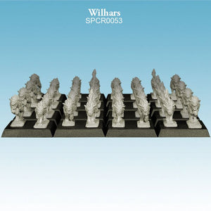 The set contains 32 one-piece high-quality resin miniatures of Wilhars and sixteen 25 mm square plastic bases. Require assembly, cleaning and painting. Scenic bases not included. The miniatures are dedicated for the Dirandis army in Argatoria Wargame.