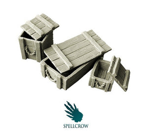 Kit contains 3 Wooden Boxes ideal for use with 28mm scale models. The product is high-quality cast resin.